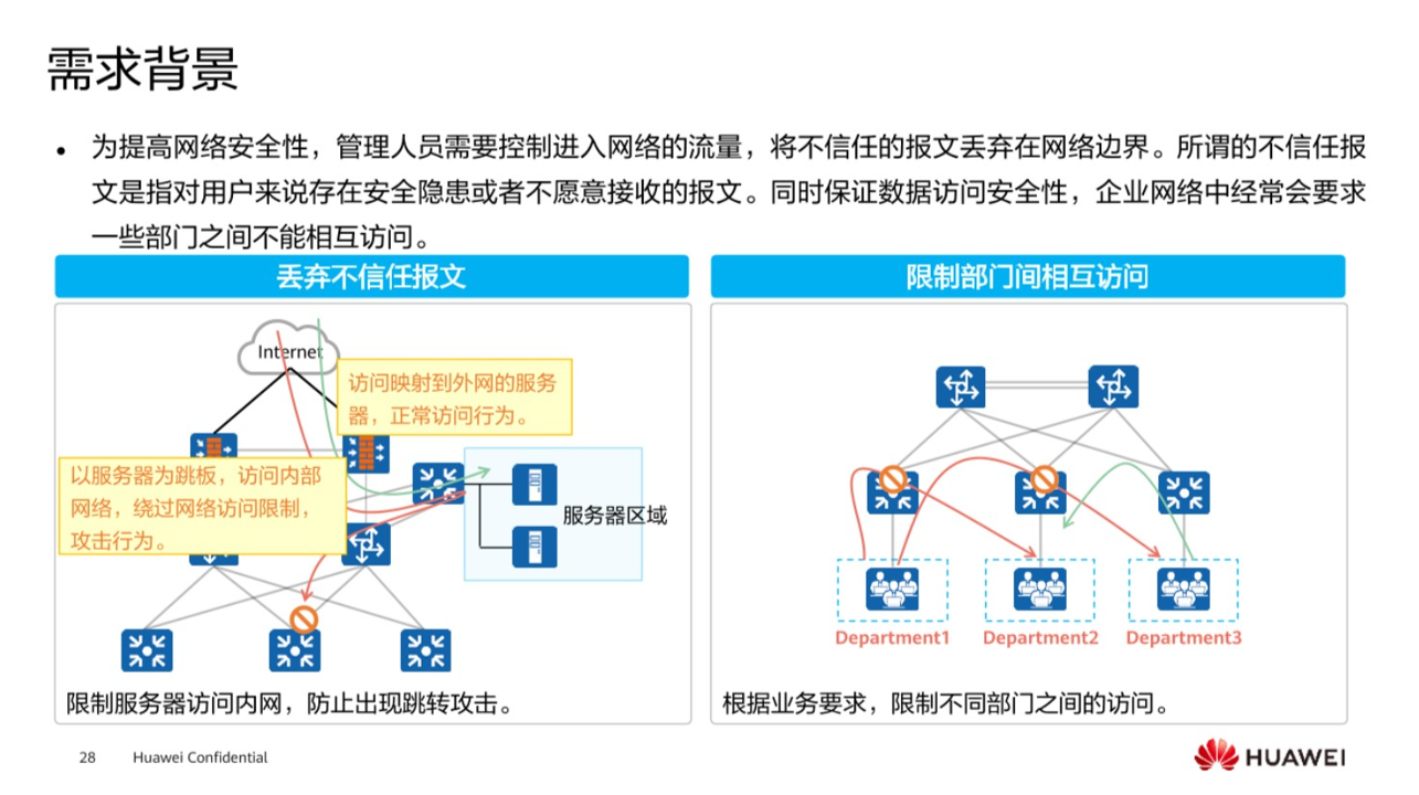 什么情况下会使用流量过滤,为了提高网络安全性,有时候需要对网络访问进行一个控制。比如说对于不想接收或者说不存在安全隐患的报文,这个时候应该拒绝接收的。或者说在一些企业里面,关于某些机密数据的访问,并不是所有人都能够正常进行获得的,这个时候可能就需要使用流量过滤来进行网络可达性这样的一个控制。