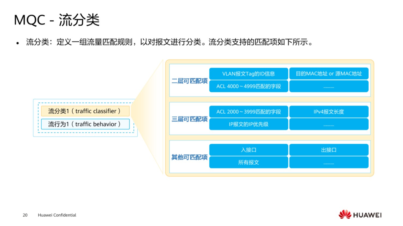 可以基于二层匹配数据,可以基于三层匹配数据,或者其它选项,流分类所匹配的参数条件非常多。