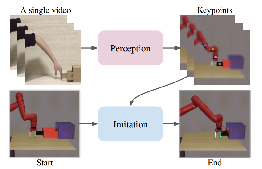 这篇论文主要的工作也是要研究如何用人类演示视频来训练机器人。先通过 MUNIT 模型(无监督图像翻译)把人类演示视频逐帧转化为机器人视角的视频 —— 翻译后的视频可能有视觉伪影,缺少结构化关键信息,无法直接用于训练;接着用 Transporter 模型从翻译后的机器人视频中提取关键点轨迹(比如机器人末端、物体中心的运动轨迹);最后用这些轨迹作为强化学习的训练目标,让机械臂的关键点轨迹与目标轨迹尽可能一致,从而学会操作技能。