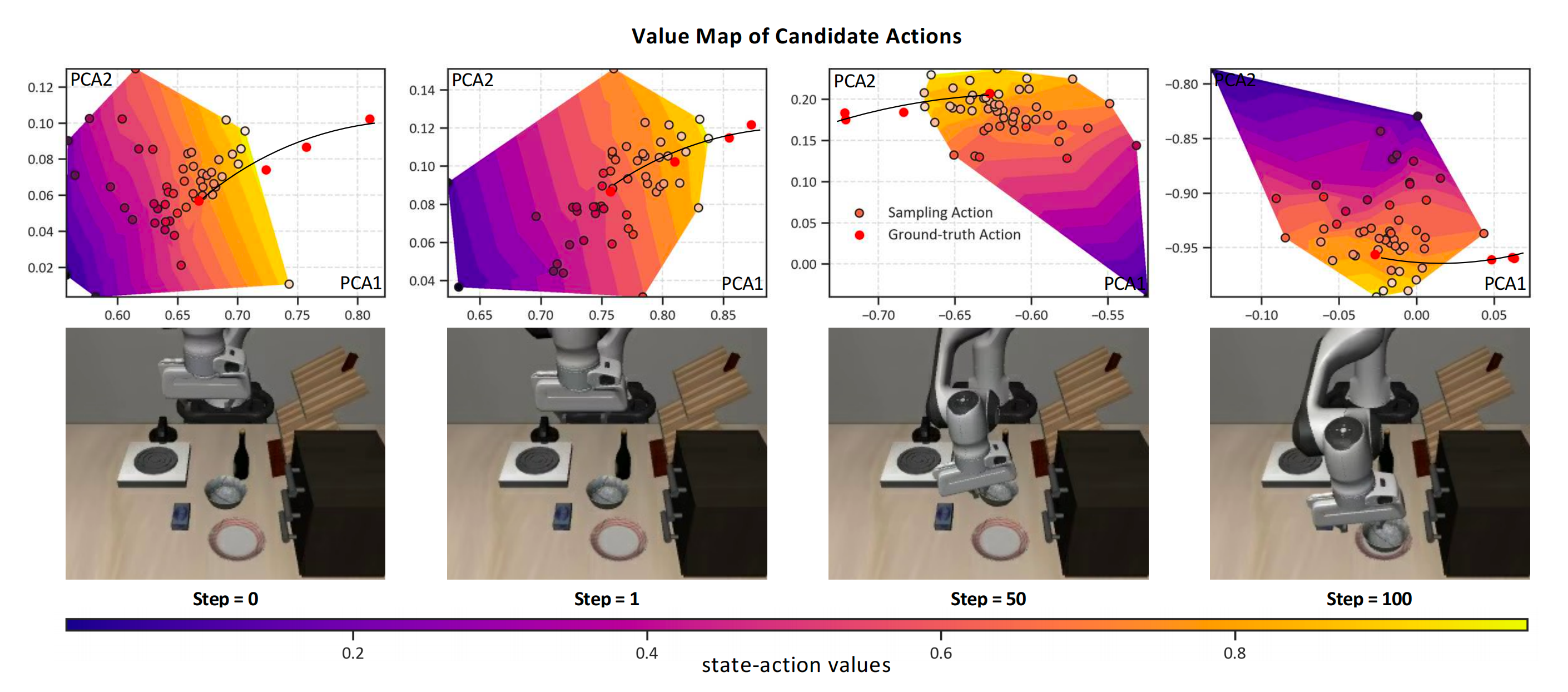 该价值图由代表不同状态-动作价值大小的区域组成,而真实动作全部位于高价值区域,这证明value-query head 可以估计合理的状态-动作价值。详细分析可以在附录. A. 2 中找到