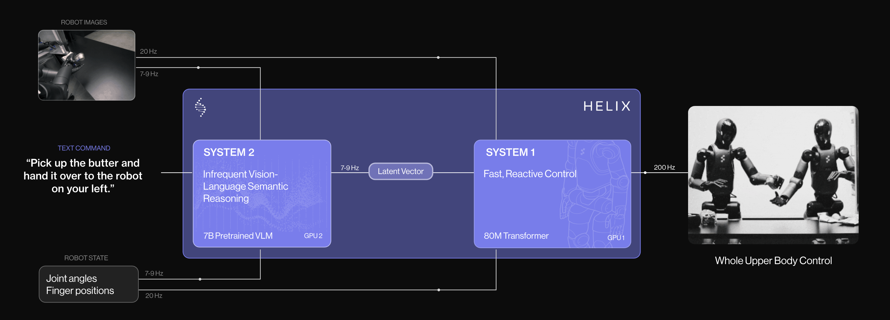 由于System 2 和System 1 的工作频率不同, 它们以异步方式协同, 在缓慢的类人思考和快速、具反应性的真实机器人控制之间实现平衡