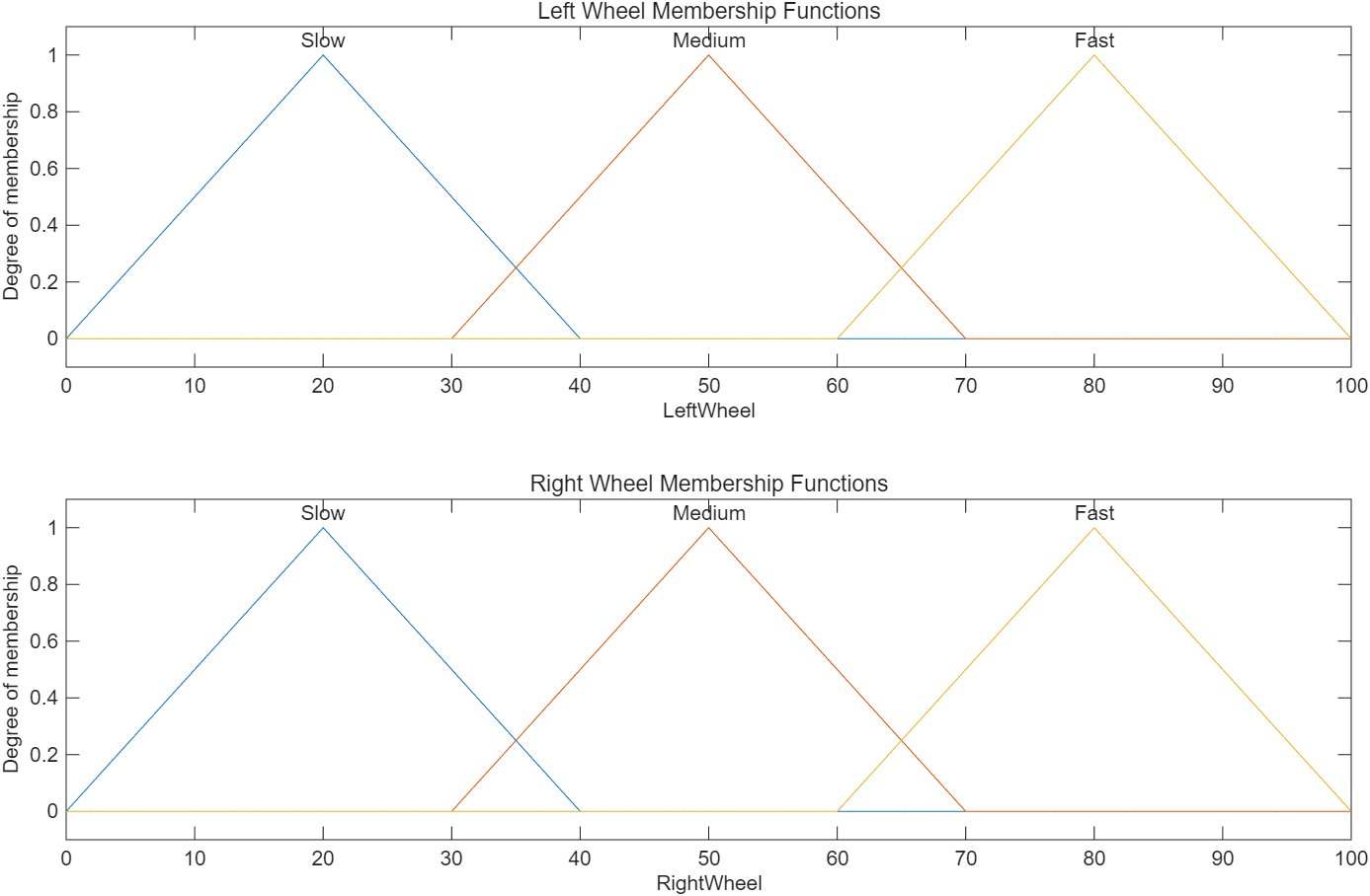 fis = addMF(fis, 'RightWheel', 'trimf', [60 80 100], 'Name', 'Fast');