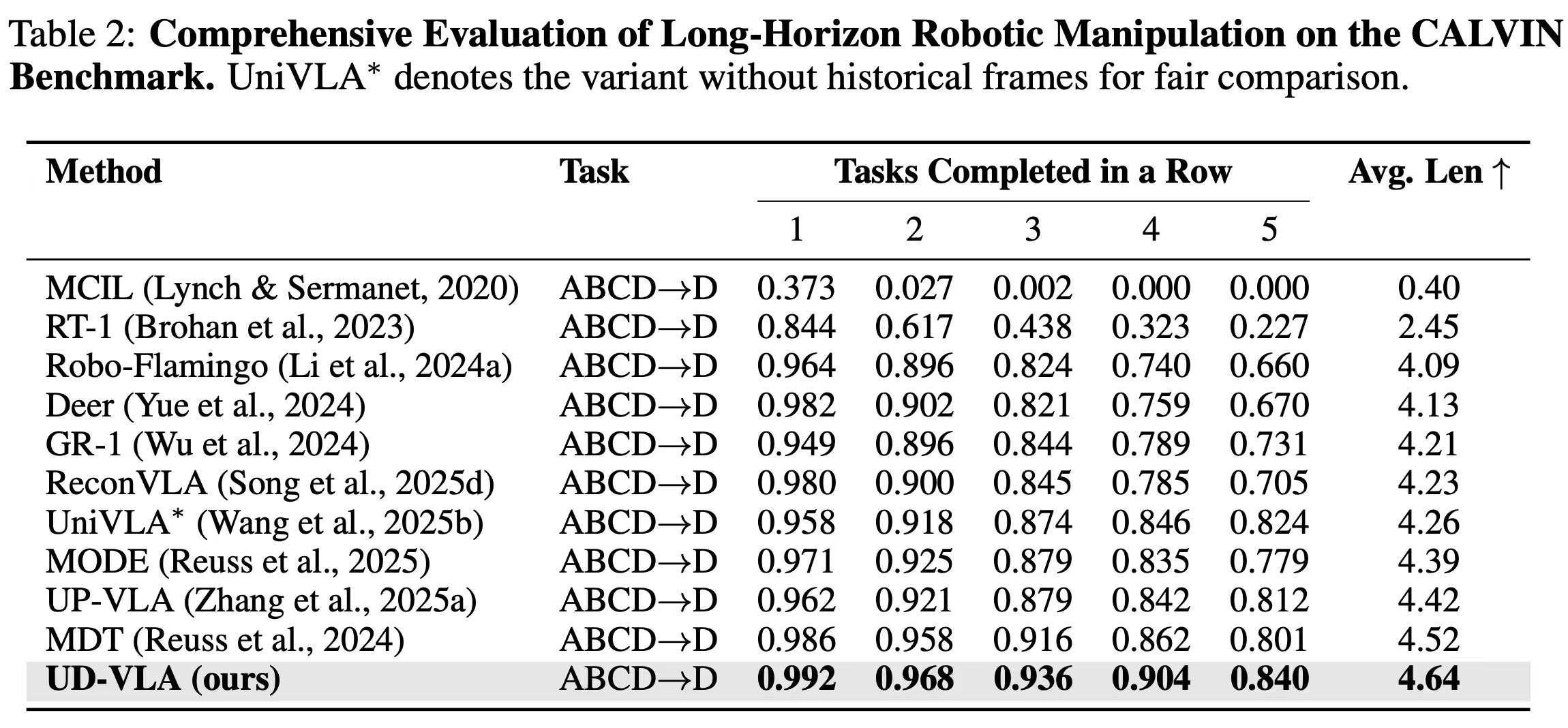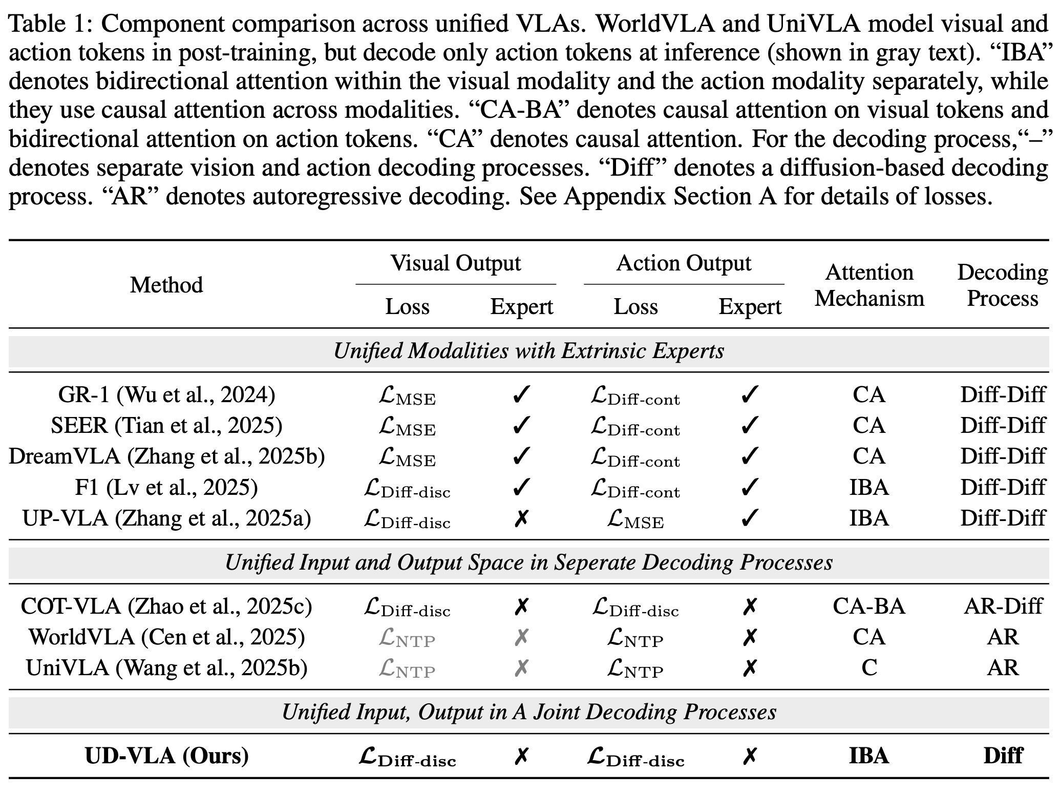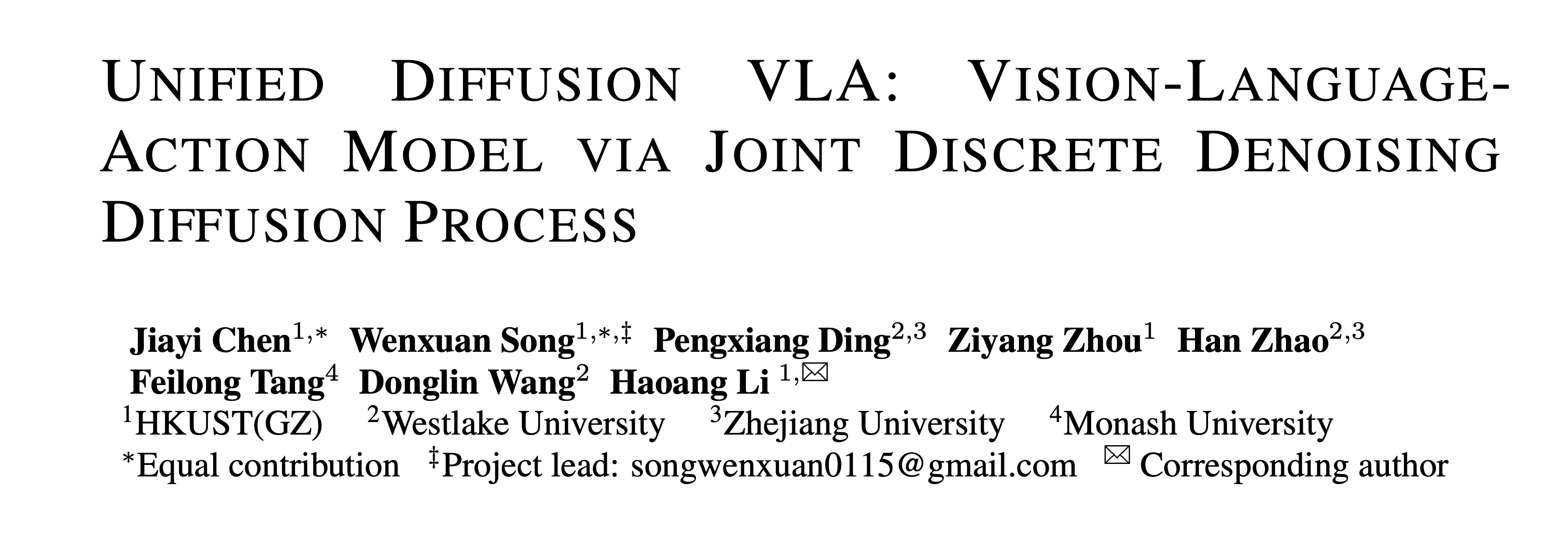 我们在Diffusion VLA方向上长期的尝试,在今年三月就探索了Parallel VLA的一种形式PD-VLA(uniform的迭代形式),它通过并行且多次迭代输出action,可以视作diffusion VLA的最早期探索,基于PD-VLA,我们进一步探索了Diffusion VLA的推理加速,通过一致性蒸馏的方式将基于OpenVLA的模型速度提升了四倍。得益于dllm的发展,Unified Diffusion VLA探索了多模态的生成理解统一的关键问题,我们希望他不仅可以作为好的开源VLA基座,也可以作为团队在diffusion VLA一系列研究上的最新结果提供给大家真正的insights。