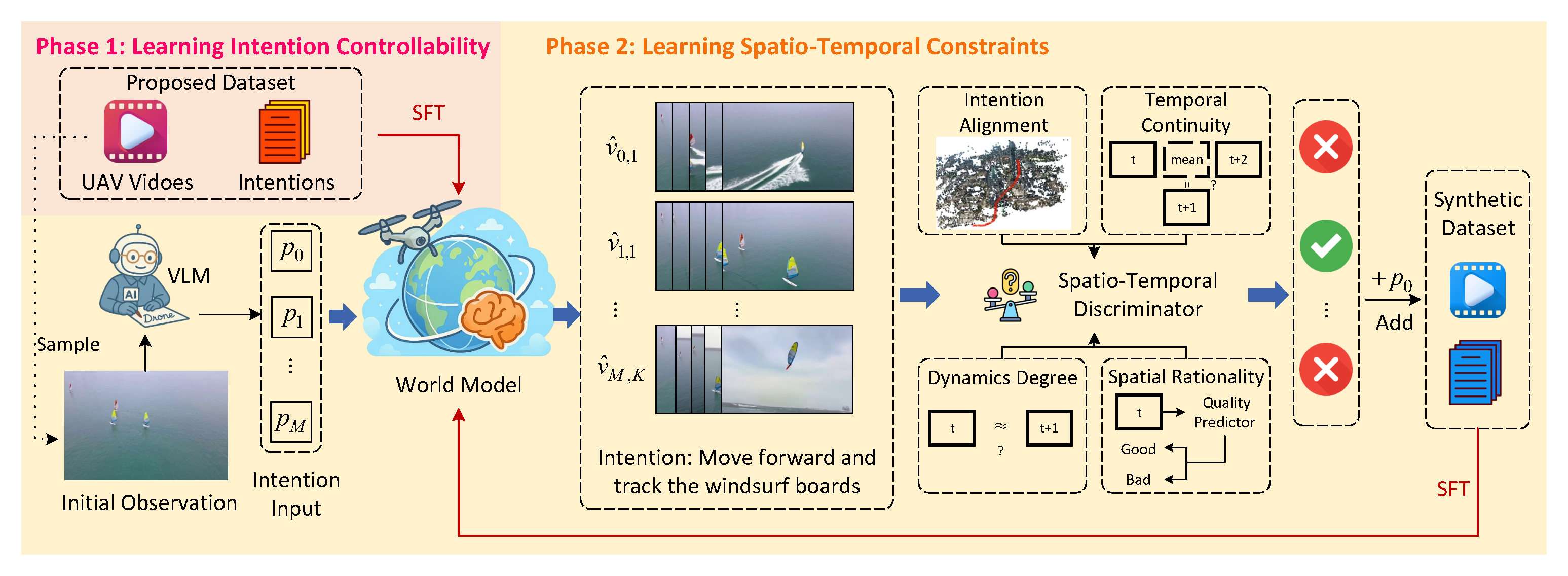 - 通过迭代 SFT 训练高质量的合成数据,确保生成的视频遵循物理时空约束,抑制不合理的生成结果。