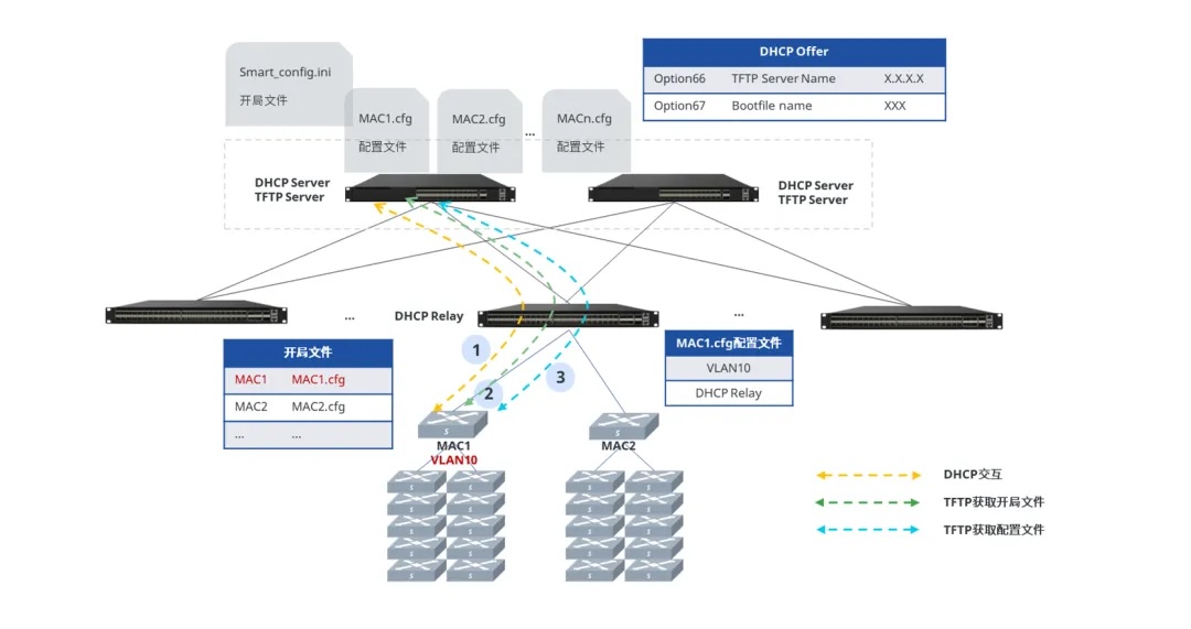 被管理交换机根据 DHCP 服务器给出的地址与TFTP Server 建立联系,获取开局文件(