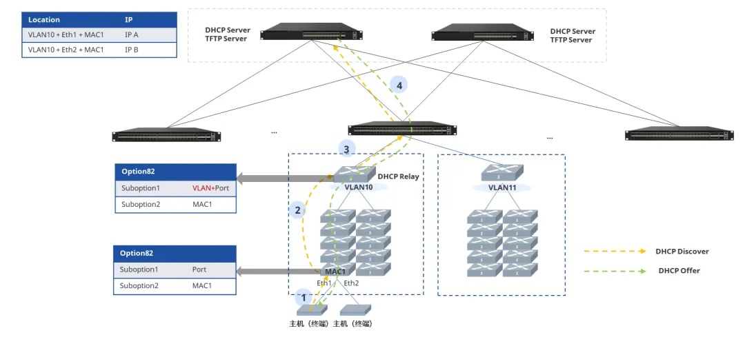 终端主机根据DHCP请求包 option 携带的主机位置自动获取到预先规划的IP地址,完成上线(比如按照设备物理安装和连接位置按序分配,后续管理时可轻松定位)