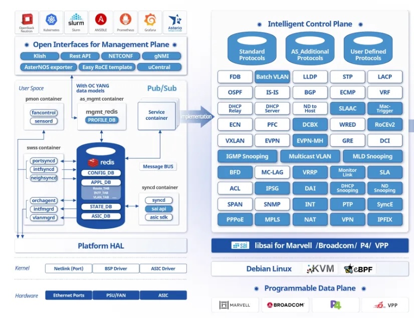 以上交换机均搭载基于SONiC的 AsterNOS 网络操作系统,容器化架构,支持完备的数据中心/云化园区网络特性。