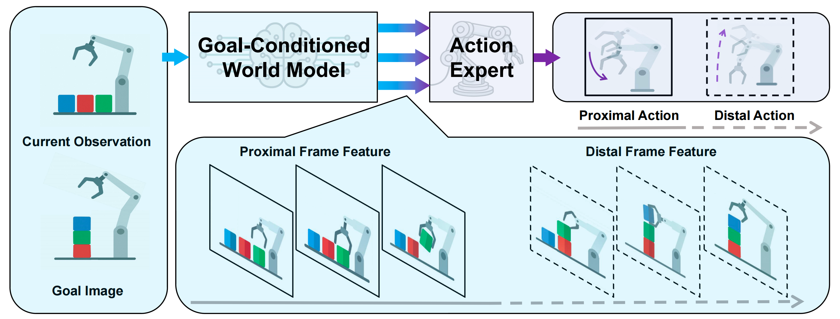 We further couple the goal-conditioned world model with an action expert via layer-wise cross-attention,allowing intermediate visual representations to guide low-level motor control in an end-to-end differentiable architecture