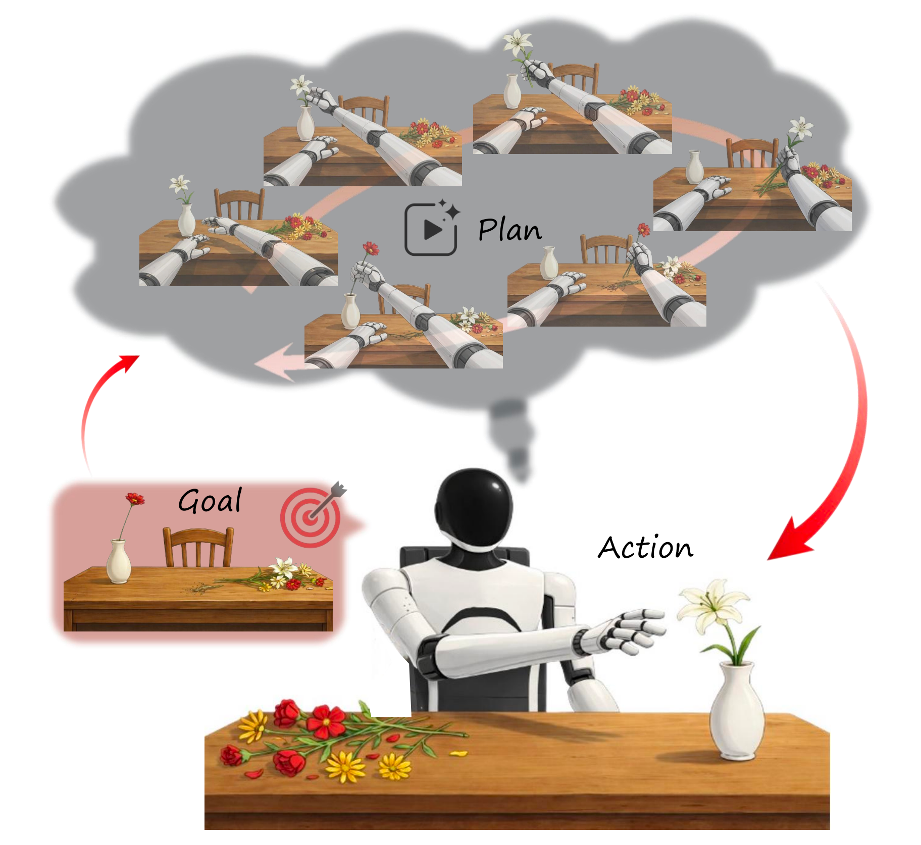 这一局限性的产生是因为标准的 GCPs 通过直接动作预测进行决策 [7],因而缺乏对任务进展、中间可行性或长时跨度一致性的显式表征 - 这个问题在使用范围狭窄的示范数据训练 GCPs 时会进一步加剧。缺少朝向目标的视觉状态转移的显式模型时,此类策略往往会对示范中的状态–动作映射发生过拟合,并且必须依赖稠密监督来弥补缺乏结构化中间引导的不足
