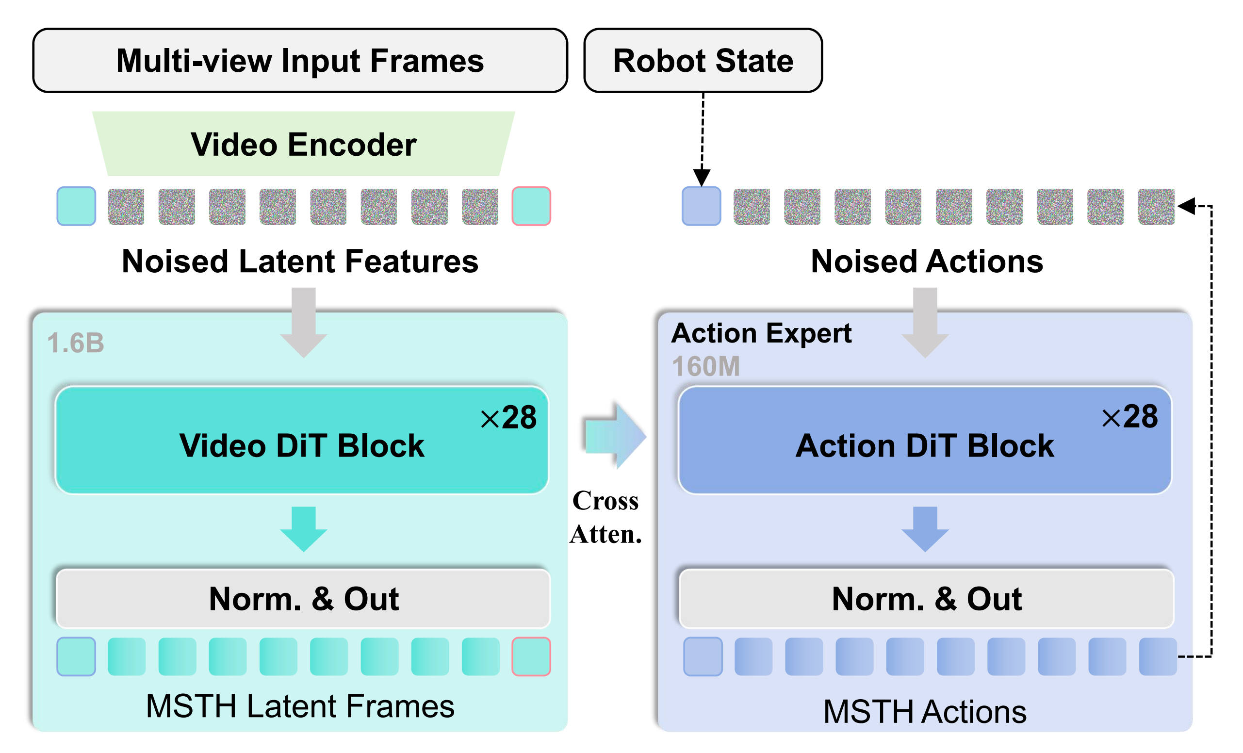 On the left, multi-view inputframes, including current observation and goal, are encoded into latents via a video encoder and concatenated with noisylatents, then refined into MSTH latent frames through VideoDiT blocks- 右侧,机器人状态和来自世界模型的多尺度特征通过交叉注意力输入到同构的 ActionDiT 模块中,从而生成具有 MSTH 结构的动作