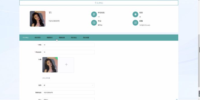 个人中心:在个人中心页面可以对个人中心、修改密码、竞赛报名、竞赛成绩、我的地址、我的收藏进行详细操作;如图5-4所示: