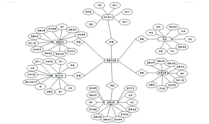 E-R图是由实体及其关系构成的图,通过E-R图可以清楚地描述系统涉及到的实体之间的相互关系。在系统中对一些主要的几个关键实体:将“竞赛信息、学生、竞赛成绩、通知公告、竞赛报名、关于我们”等作为实体,它们的局部E-R图,如图4-2所示: