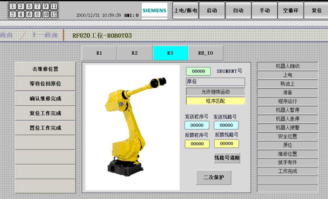 10台Fanuc发那科机器人通过Profinet通讯,它们是焊装工作的核心执行者。每台机器人都有其特定的焊接任务和轨迹。