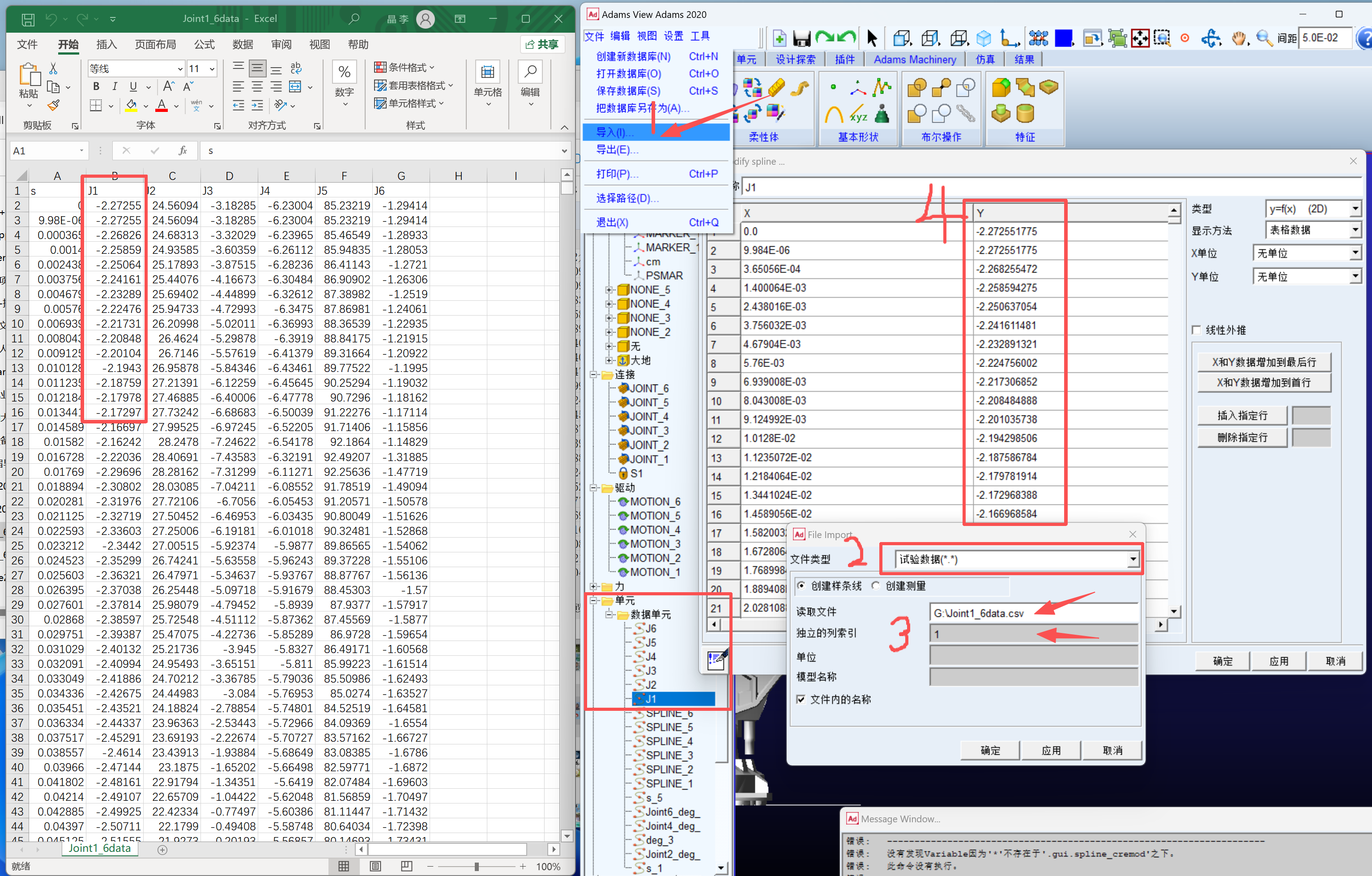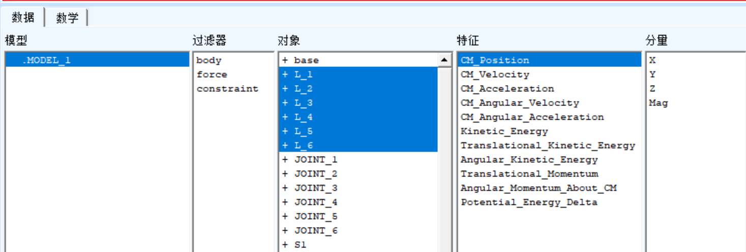 将 MATLAB 或实验采集的通过逆运动学求解的各关节角度值表,将其导出并保存为.txt或.csv格式,然后将其导入到 ADAMS 中生成样条曲线,最后在各个驱动上添加相应的驱动函数。
