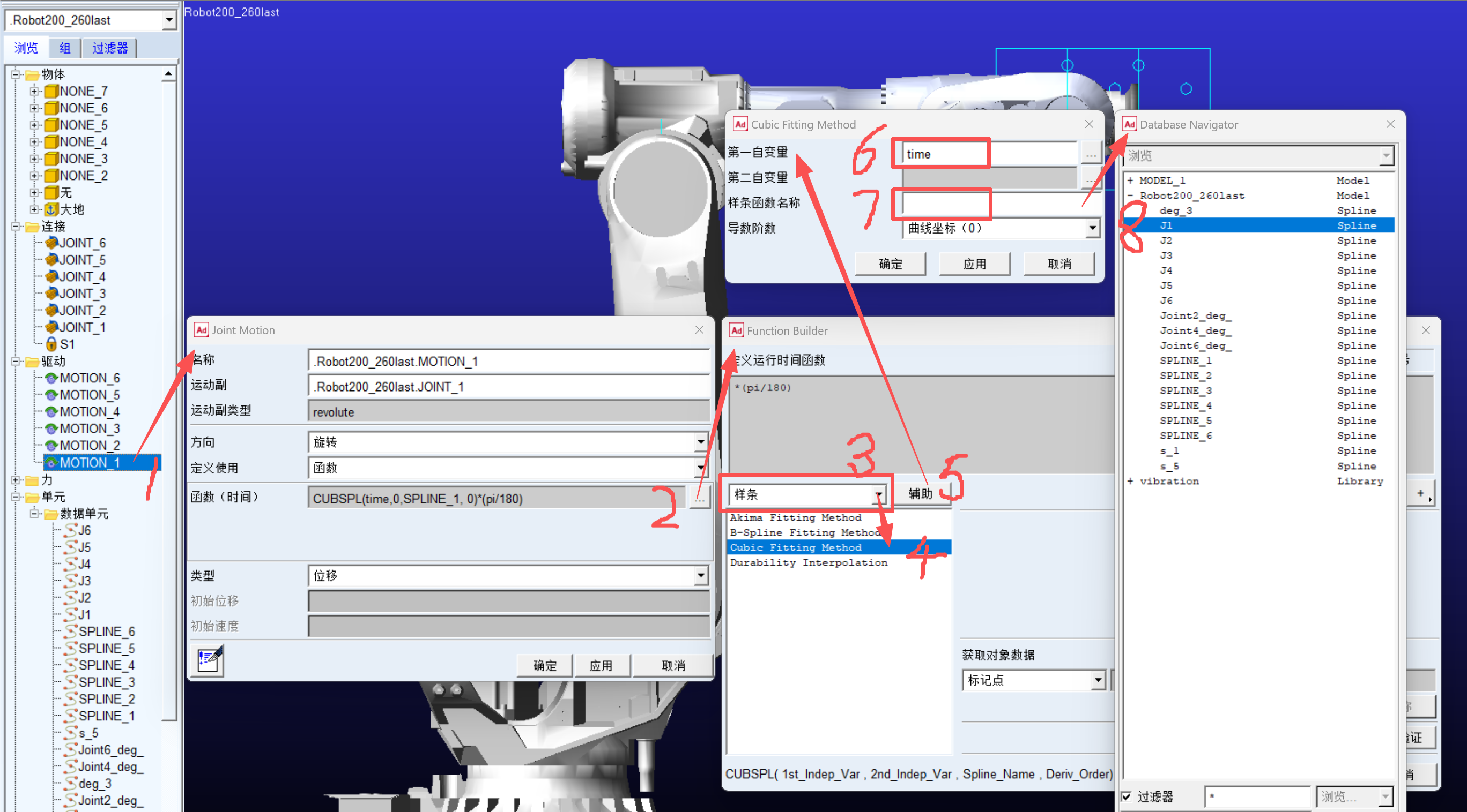 图中第3步下拉列表选样条,第5步点击辅助后“第一自变量”填time,样条函数名称选对应关节,点“确定”或“应用”(只点其中一个!不然会重复出现两个样条函数!)在Function Builder里显示的函数后再手动输入*(pi/180),因为默认adams单位是弧度,导入的表格单位是角度,需要转换。