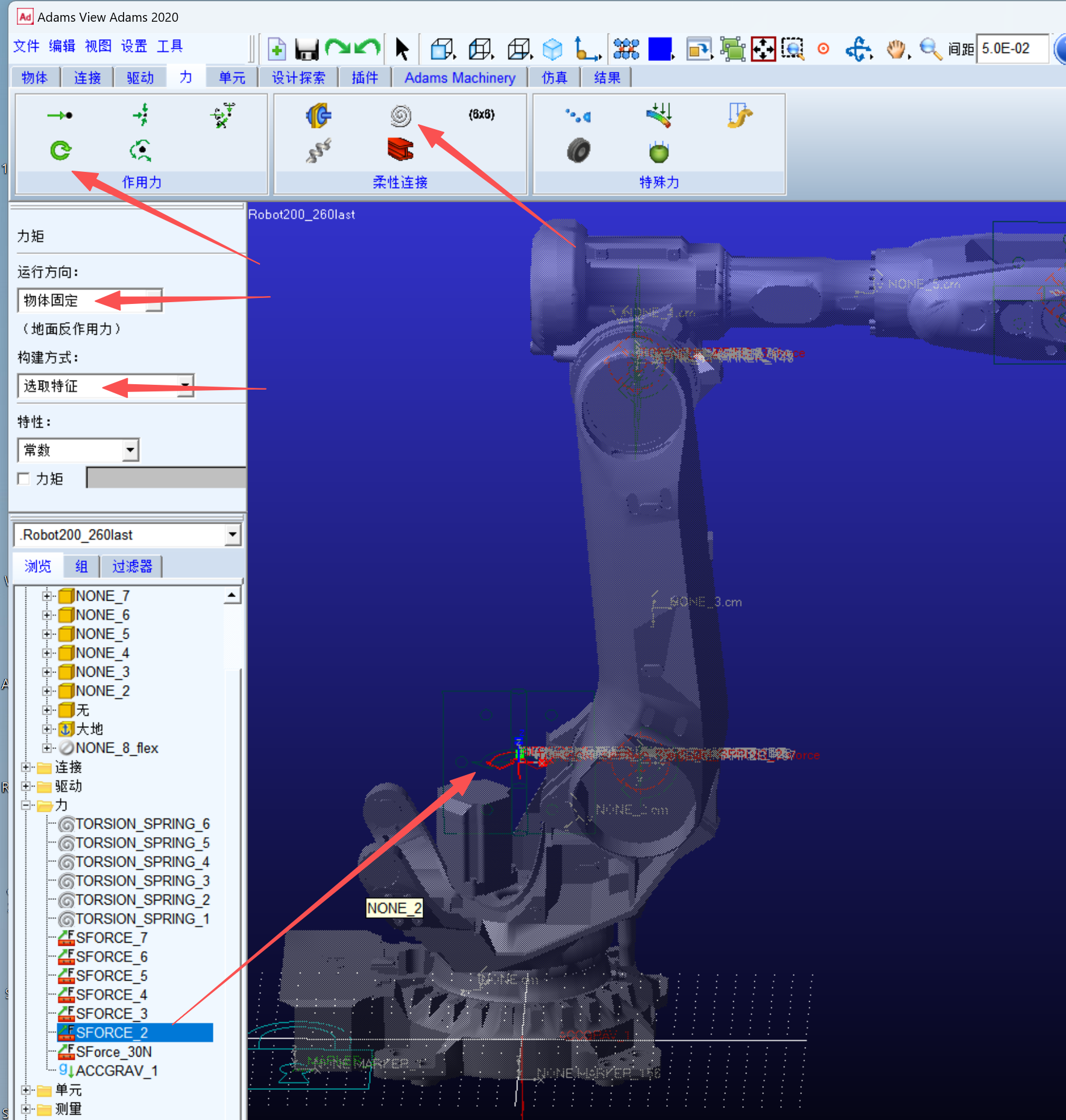 如果是柔性关节,需要先设置扭转弹簧阻尼器,再设置力矩驱动。关节1-6扭转弹簧阻尼器坐标设置同上;添加【力】里的力矩,构建方式默认[垂直于格栅],也就是绕z轴的单向力矩,可应用于关节1,但不适用于其他关节,所以关节2构建方式选[选取特征],靠近标记点Marker的位置选择z方向。