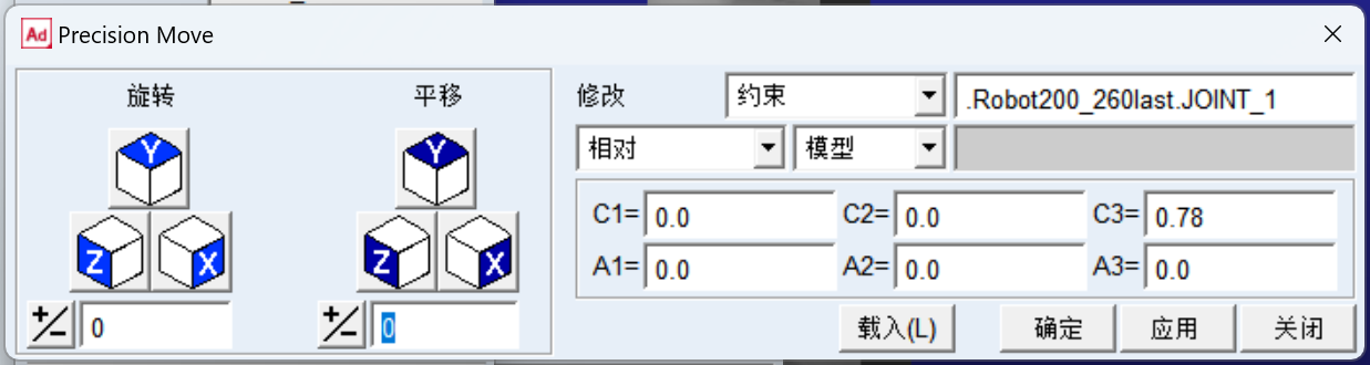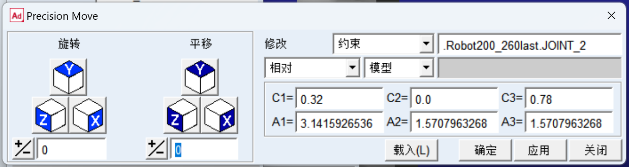 这里的C1~C3表示沿x,y,z平移距离;A1~A3表示绕x,y,z旋转,是弧度制。如:A1=3.1415926536 表示绕x转180°,A2=1.5707963268 表示绕y转90°。设置完可以测量一下末端坐标 [ 1.6625, 0, 2.105 ] 验证正运动学。