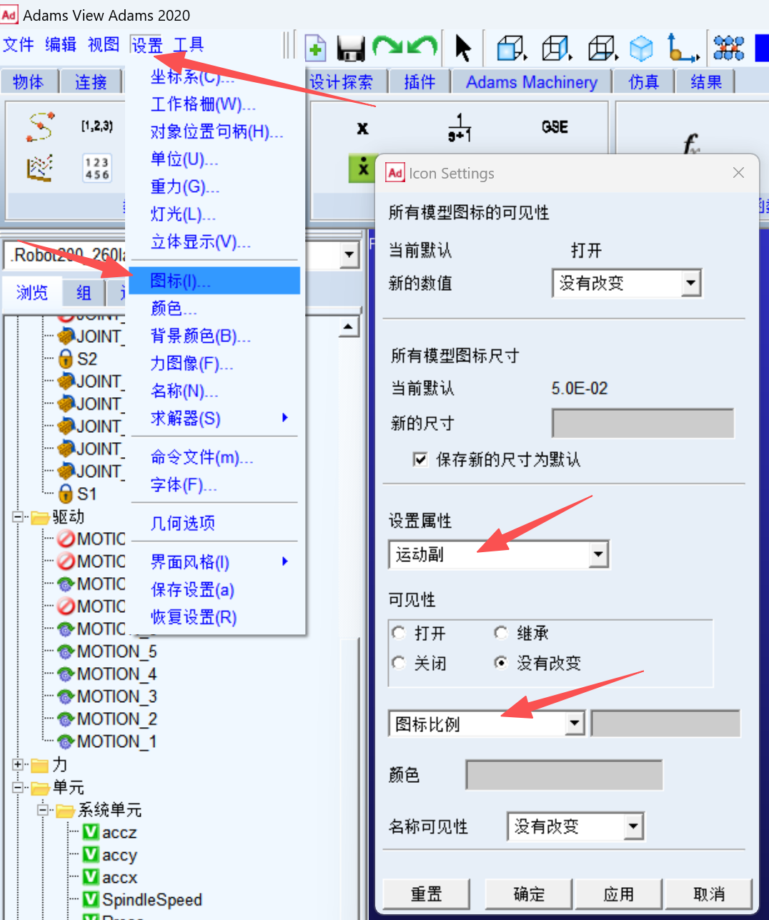 图标太小可以放大,【设置属性】选择运动副,下面的下拉列表选【图标比例】,输入2。