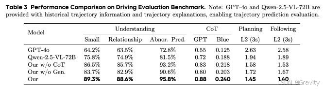 - 语义理解和推理,包括分析交通场景、识别关键物体、推断交互意图,并生成可解释的CoT推理过程