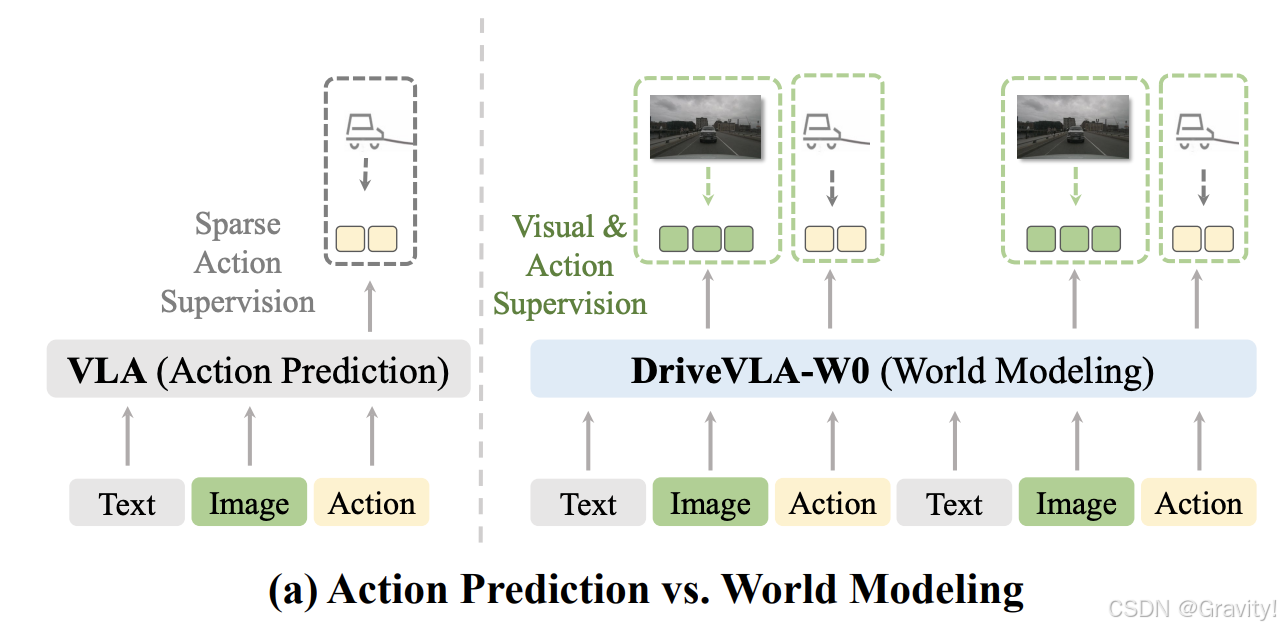 - 动机:VLA的训练仅依赖于稀疏的、低维度的动作信号(如转向、油门等),模型无法充分利用其表征能力来学习丰富的世界动态表示
