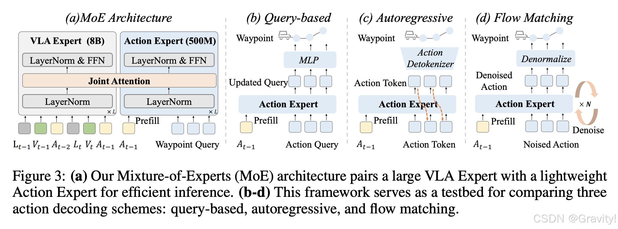 - Action embeddings设计:50%用真实轨迹(准确的指导信号),50%用规划专家预测的轨迹(增强鲁棒性,促进专家对齐)