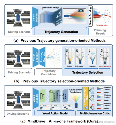 - MindDrive为轨迹生成(WM) + 轨迹选择(VLM)