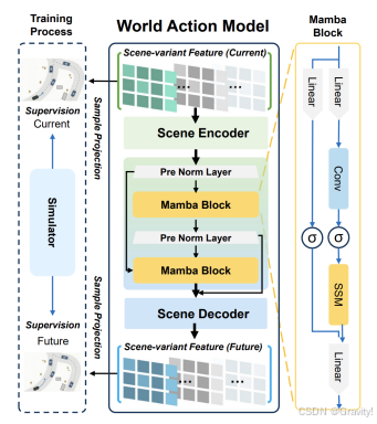 - 时序推理 (Mamba Blocks):然后使用 Mamba(一种选择性状态空间模型)块进行时序推理。Mamba 能以线性计算复杂度高效地模拟时间动态,预测未来几个时间步的潜在场景状态。论文中采用了两个 Mamba 块进行堆叠,以增强时序建模能力。