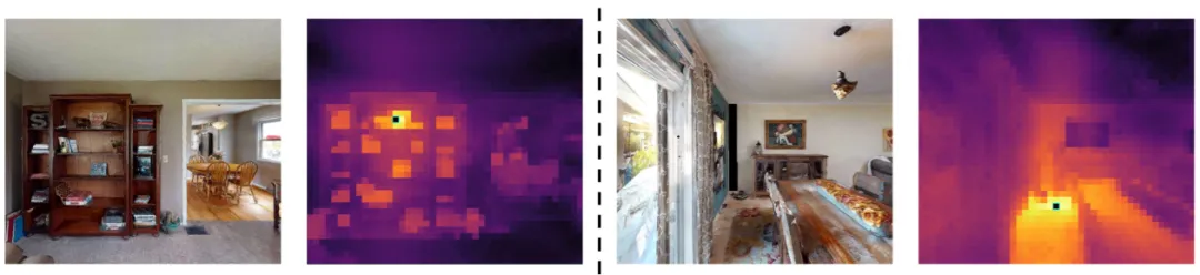 ▲图3|DINOv3 特征可视化:模型在图里会把哪些区域当成“相似地标”。对每张图先选一个小区域作为查询点,再计算它与整张图其他区域的特征相似度,并画成热力图。颜色越暖表示越相似,用于直观展示 DINOv3 的中层特征能抓住哪些结构或纹理线索