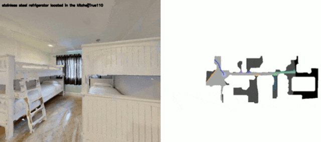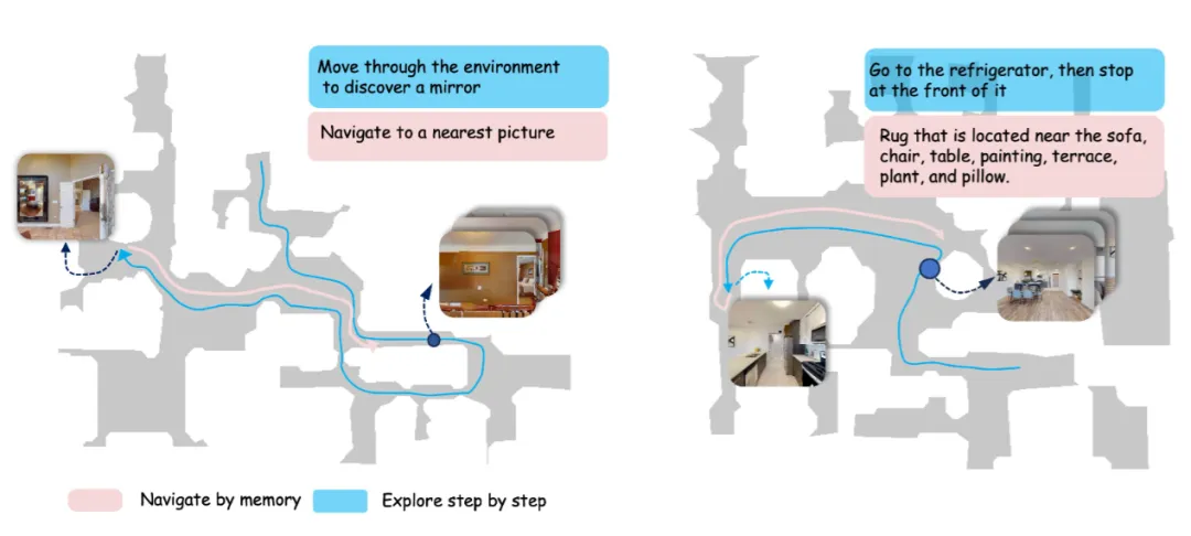 ▲图5|两种导航模式对比:一步步探索 vs 查记忆走“近似最优路”。在 Habitat-Sim 中可视化 GOAT-Bench 的导航过程:一种是逐步探索未知区域、边走边找;另一种是在记忆中已有线索时,直接按记忆规划更接近最短的路径,体现“终身记忆”带来的效率优势