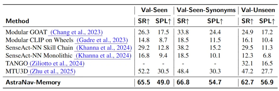 定量结果显示:在未见场景上,AstraNav-Memory 的成功率与路径效率达到 62.7% SR / 56.9% SPL,并显著高于文中对比的若干方法。