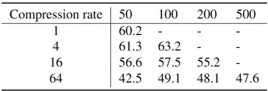 压得过狠(例如 64×)会让性能明显下滑,说明信息被压没了;而适中的压缩通常能在保持效果的同时,把算力开销压下来。