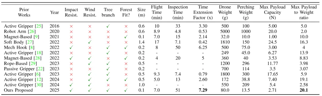 图7|不同栖息式微型飞行器的性能对比表