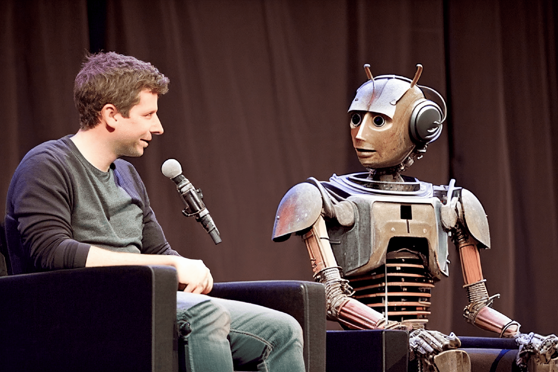 注:这是我让 Midjourney 画的 Sam Altman 和机器人开一个座谈会的图片,除了那个在空中漂浮的话筒,其余的一切都好像真的一样。