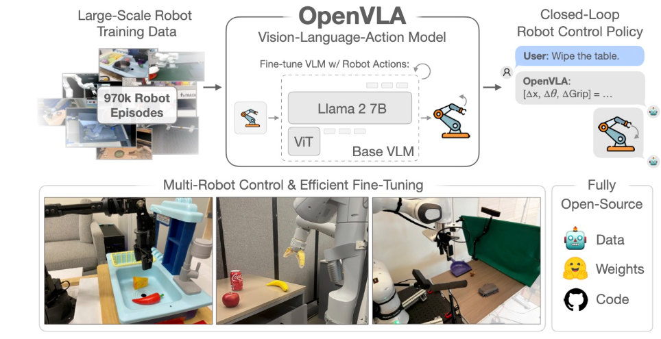 OpenVLA 提出了一个开源的 VisionLanguageAction(VLA)模型,用于通用机器人控制。该模型通过融合视觉感知和自然语言指令,实现了机器人在多种操控任务上的跨任务泛化能力。作者利用近百万条机器人示范数据进行训练,并提供了统一的评测基准,使研究者可以在标准任务上进行性能比较。OpenVLA 支持动作预测与任务执行反馈循环,兼顾效率与泛化能力,为 VLA 在实际操作中的可复现性和开源生态奠定了基础。