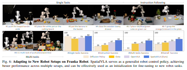 SpatialVLA 通过空间表征增强 VLA 模型,使其能够在复杂三维环境中泛化执行任务。论文提出对场景几何和对象关系建模的方法,并结合多模态输入(视觉 + 语言 + 空间信息)进行策略学习。实验表明,该方法在开放世界操控任务中性能优于基础 VLA 模型,是 VLA 泛化能力提升的重要技术手段。