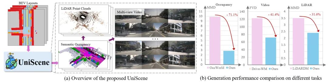 亮点:UniScene 针对自动驾驶高质量数据获取成本高昂的瓶颈,提出了一个以占据(occupancy)为统一中间表达的多模态生成框架。该方法采用分层生成思路:首先从用户定义的道路布局生成具有几何与语义信息的BEV占据图,再基于该结构化表示分别生成多视角视频与LiDAR点云。这种“布局→占据→多模态数据”的渐进式生成机制,不仅降低了复杂场景合成的难度,也使占据图自带标注属性,可直接为下游任务提供监督信号。实验表明,该方法在占据、视频与点云生成质量上均优于此前方案,且所合成数据能有效提升感知、预测等任务的性能。从工程角度看,该框架的核心价值在于提供了一套可复用的多模态数据生成流水线,能够从同一场景布局同步产出视频、点云与占据标注,显著降低不同自动驾驶模块在数据制备上的重复投入。