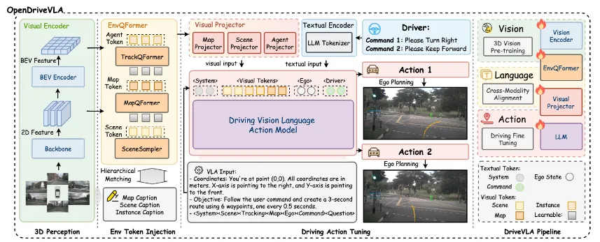 亮点:OpenDriveVLA 是一个开源的端到端驾驶 VLA 模型,其核心在于构建一个统一的生成框架,以直接根据多模态输入(包括2D/3D实例级视觉表示、车辆状态及语言指令)输出驾驶动作。为解决视觉与语言模态的语义鸿沟,模型采用分层视觉-语言对齐方法,将结构化视觉 token 映射到统一语义空间,实现有效融合。在轨迹生成阶段,模型通过自回归解码显式建模车辆与环境的交互关系,使规划结果具备空间与行为感知能力。该模型在 nuScenes 数据集上验证了其在开放环路规划与驾驶问答任务上的有效性,其开源实现为研究社区提供了一个可参考的、整合感知、推理与规划的 VLA 驾驶系统基线。
