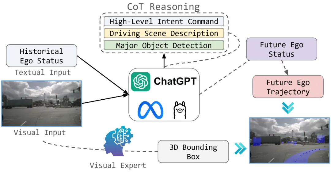 亮点:OpenEMMA 针对多模态大语言模型在端到端自动驾驶中训练成本高、部署难度大的现实瓶颈,提出了一种轻量化且可泛化的框架:通过引入 Chain-of-Thought 推理机制,引导模型在完成驾驶决策时显式生成逻辑推理链条,从而在多种现有 MLLM 上稳定提升其在复杂场景下的泛化与可靠性。该框架无需从头训练巨量参数,显著降低了算力与数据门槛,并以完整开源代码提供了一套可复用的工程模板,使研究者能够快速将不同的多模态大模型适配到端到端驾驶任务中,有效加速了 MLLM 在自动驾驶领域的落地探索。