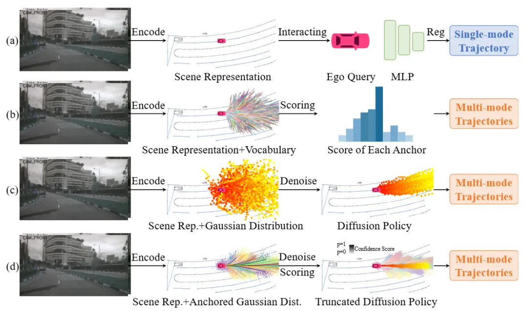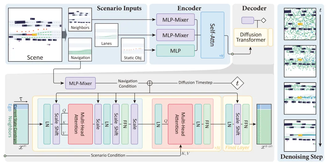 亮点:针对模仿学习在自动驾驶规划中常产生的“平均解”困境,提出了一个基于Transformer的扩散规划模型。其核心是通过扩散过程从噪声中生成多模态轨迹,从根本上支持对同一场景的多种合理驾驶行为进行表达,且无需依赖后置手写规则来修正轨迹质量。该模型创新性地将轨迹预测与自车规划置于同一架构中进行联合建模,以促进车辆间更自然的交互配合。关键技术在于引入了通过学习型打分函数实现的梯度引导机制,能够安全、灵活地将生成过程导向目标方向,从而在开放环境中实现既多样又可靠的规划。该方法在nuPlan大规模闭环基准上取得领先性能,并在一套200小时的实车配送数据集上验证了其对不同驾驶风格的适应能力。