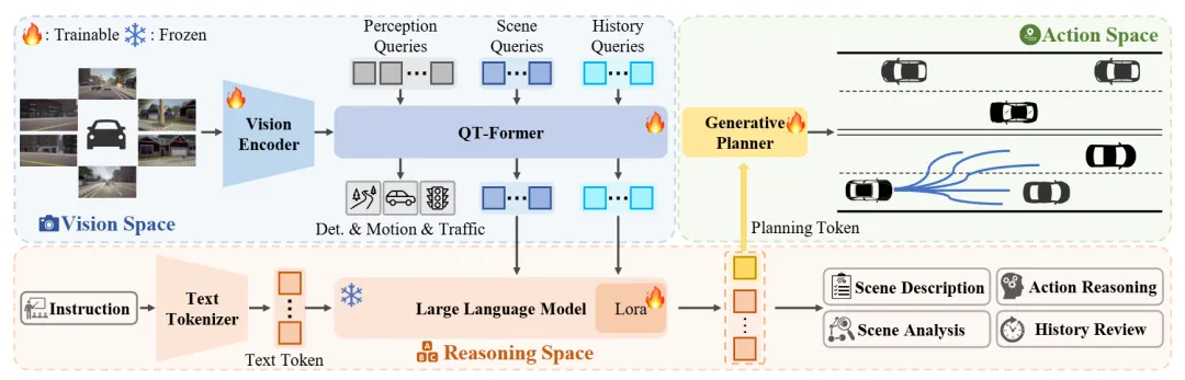 亮点:ORION 针对端到端自动驾驶中因果推理与轨迹生成脱节的核心问题,提出了一个统一对齐视觉、推理与动作空间的框架。它通过 QT-Former 聚合历史信息,并利用 LLM 进行场景理解后输出高层“规划 token”,再由生成式规划器将该 token 解码为具体、可执行的多模态轨迹。该方法的关键在于进行端到端的联合优化,使语义推理能够直接驱动稳定、合理的轨迹生成,从而在 Bench2Drive 闭环评测中显著提升了驾驶得分与成功率。