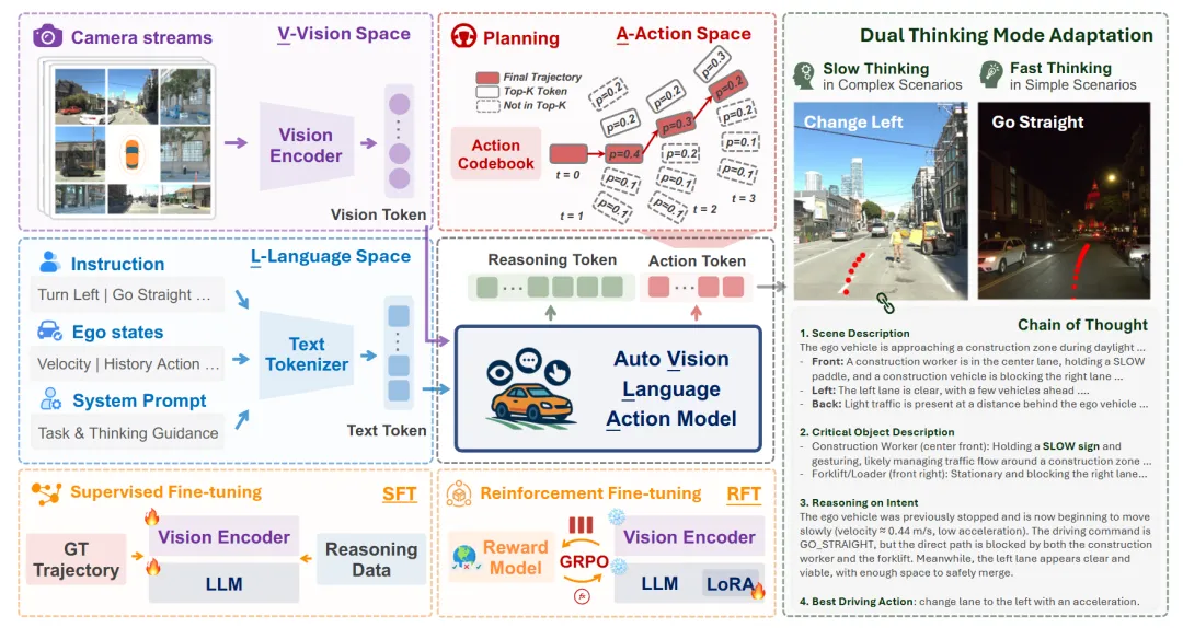 亮点:AutoVLA 针对现有 VLA 驾驶模型输出动作物理可行性差、系统冗余且推理效率低下的问题,提出了一个统一的自回归生成式框架。其核心创新在于将连续轨迹离散化为物理可行的动作 token,使语言模型能够像生成文本一样直接输出可执行规划,从而在架构层面确保了动作的合理性。该模型通过监督微调学习了自适应推理机制,可根据场景复杂度在“快思考”(直接规划)与“慢思考”)间切换;后续的强化学习微调进一步优化了规划质量并抑制了不必要的冗长推理。在 nuPlan、Waymo 等多个开环与闭环基准上的实验验证了其竞争力。该工作的核心开源价值在于提供了一套完整的工程配方,包括动作 Token 化设计、快慢思考训练与强化微调策略,为构建高效、可靠的 VLA 规划基线提供了可直接复用的模板。