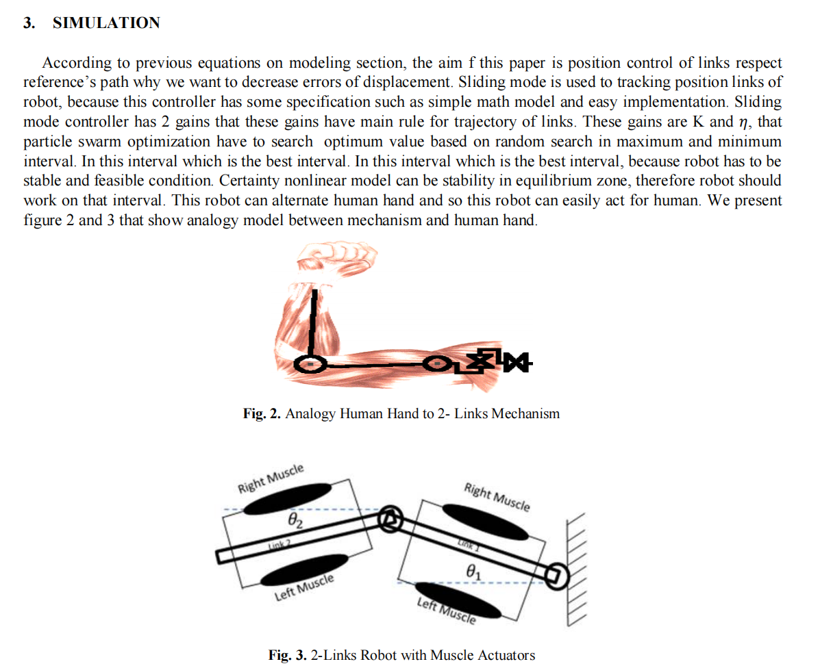 康复治疗是通过机械装置对肌肉骨骼系统疾病进行干预的医疗手段,其核心目标是帮助行动受限者实现最低限度的日常活动。气动执行器凭借其卓越的功率重量比、清洁特性、可调节流体特性、易于维修且成本低廉等优势,成为人体交互机器人的重要选择。这类执行器还具备流体可压缩性与刚度可调等特性。鉴于其在医学领域的关键作用,以及对身体组织具有高度保护性的精准控制能力,本项目重点研发配备高精度控制器的气动执行器,以构建康复治疗所需的多样化机械装置。论文首先建立了气动执行器的数学模型,基于该模型推导出执行器的微分方程。由于比例阀成本较高,本研究采用电磁阀作为执行器,并运用滑模控制理论实现位置精准调控。针对该系统的关键技术挑战,本项目重点研究康复治疗中双连杆机构的最优路径规划。为实现机械装置路径规划的最小跟踪误差,我们采用粒子群优化算法对滑模控制中的最优增益控制器进行寻优。