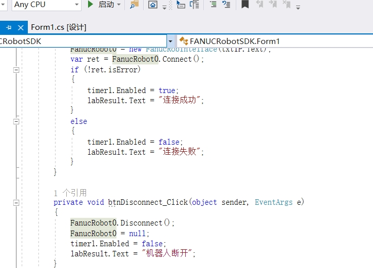 通过这段代码,我们实现了与发那科机器人控制器的连接和断开功能。Connect方法接受机器人控制器的IP地址作为参数,建立网络连接。Disconnect方法则用于断开与控制器的连接。