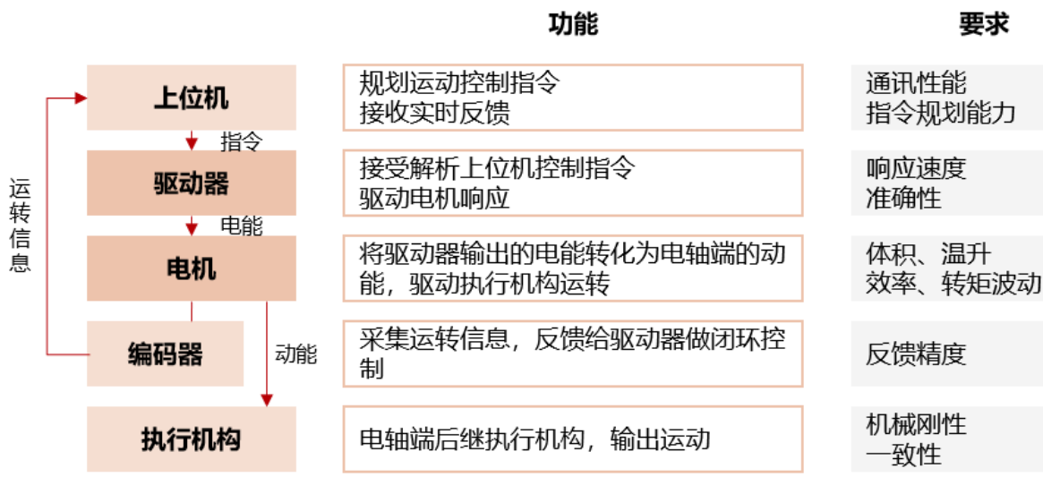 伺服驱动器是伺服电机的控制器,通常通过位置、速度、力矩三种方式对伺服电机进行控制,以实现高精度的传动系统定位;伺服电机是伺服系统的执行元件,用于把接收到的电信号转换为电动机转轴的角速度或角位移;编码器将信号或数据进行编制,转换为可用于通讯、传输和存储的信号形式。在伺服系统工作时,伺服驱动器先向伺服电机发出驱动信号使其转动,同时伺服电机的编码器再将伺服电机的运动参数反馈给伺服驱动器,再由伺服驱动器对信号进行汇总、分析和修正。