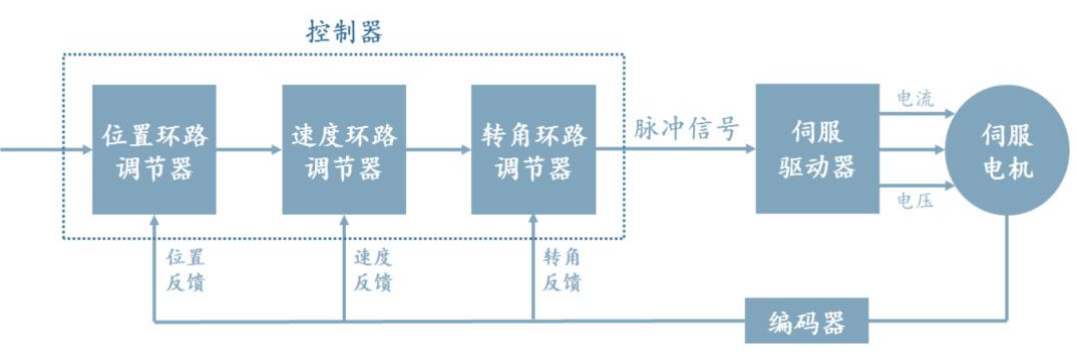控制器向伺服系统发送运动指令,电机和机械系统的多种传感器经过信号处理将实时信息反馈给控制器,再由控制器进行实时调整,以保证整个系统稳定运行。