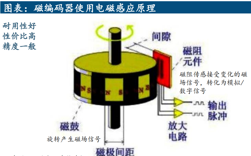 磁性编码器由磁阻传感器、磁鼓和信号处理电路组成,应用了电磁感应的原理,将磁鼓刻录成等间距小磁极,旋转时产生周期分布的漏磁场,磁传感器探头把变化的磁场信号加以处理转化成计算机可识别的信号。磁编码器由于结构较光编码器更简单,因此成本低,耐用性好,但精度不如光编。