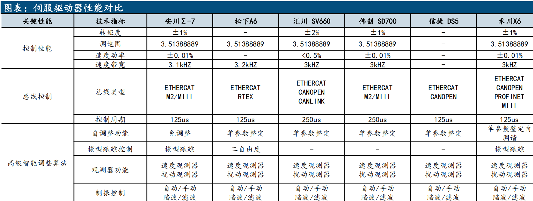 伺服系统核心技术包括三环(电流环、速度环、位置环)综合矢量控制技术、高级智能调整算法技术、高速高精度编码器技术、高速总线控制技术等。