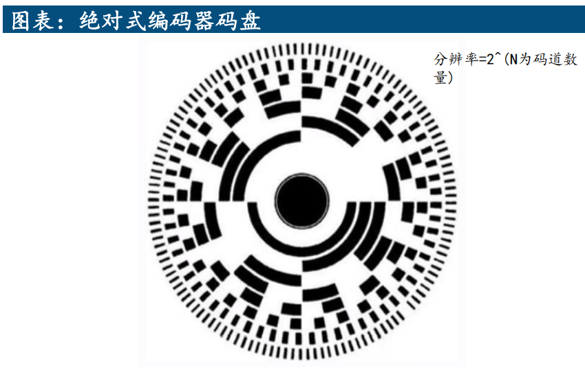位数是衡量绝对值编码器分辨率的重要指标。增量式编码器的分辨率为编码器旋转一圈所产生的脉冲数,即脉冲数/转(PPR),码盘上透光线槽的数目其实就等于分辨率,也叫多少线,如将码盘分成2500刻线(2500线),则码盘旋转一圈输出2500个脉冲。绝对式编码器的分辨率则用位数(bit)衡量,绝对式编码器的码盘上沿径向有若干同心码道,每条码道上由透光和不透光的扇形区相间组成,相邻码道的扇区数目是双倍关系,码盘上的码道数就是它的二进制数码的位数,码道越多,分辨率就越高,如17位绝对式编码器的分辨率就是2^17=131072PPR。
