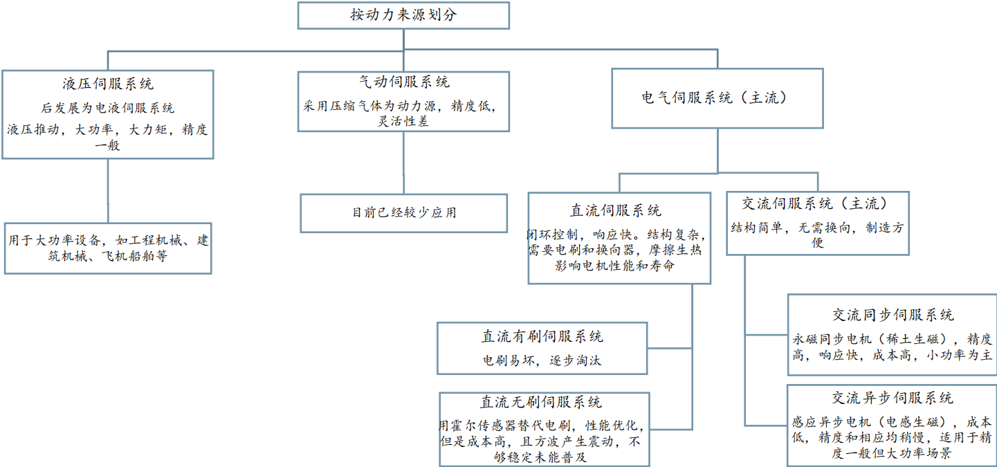 按动力来源划分,伺服系统可分为气动伺服系统、液压伺服系统和电气伺服系统。 气动伺服系统是最早普及的,采用压缩气体为动力源,精度低,灵活性差,目前已经较少应用;液压伺服系统是指使用液压油和泵,推动油缸执行动作,后结合电气伺服发展为电液伺服系统,主要用于大功率设备,如工程机械、建筑机械、飞机船舶等。电气伺服系统当前运用最广泛,它是在20世纪50年代在电气控制技术有所突破后发展形成的,又可细分为直流有刷伺服、直流无刷伺服、交流同步伺服、交流异步伺服。