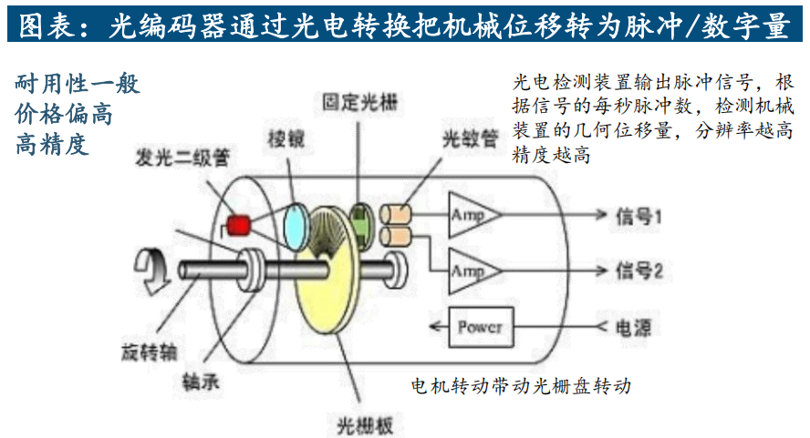 根据工作原理不同,可分为光学编码器和磁性编码器。二者的主要区别在成本、精度和耐用性三个方面。光学编码器由光源、码盘和光电敏感元件所组成,通过光电转换将输出轴上的机械几何位移量转换成脉冲或数字量,光编码器寿命长、精度高,但成本也较高。